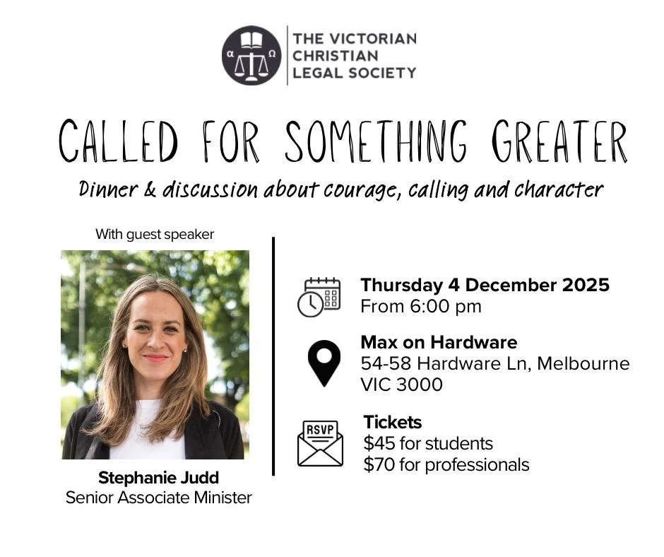 The Victorian Christian Legal Society invites you to an evening of connection and reflection as we explore what it means to live with courage, conviction, and character in the legal profession.
